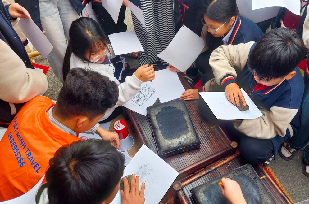 HS thích thú trải nghiệm gian hàng làm tranh dân gian Đông Hồ